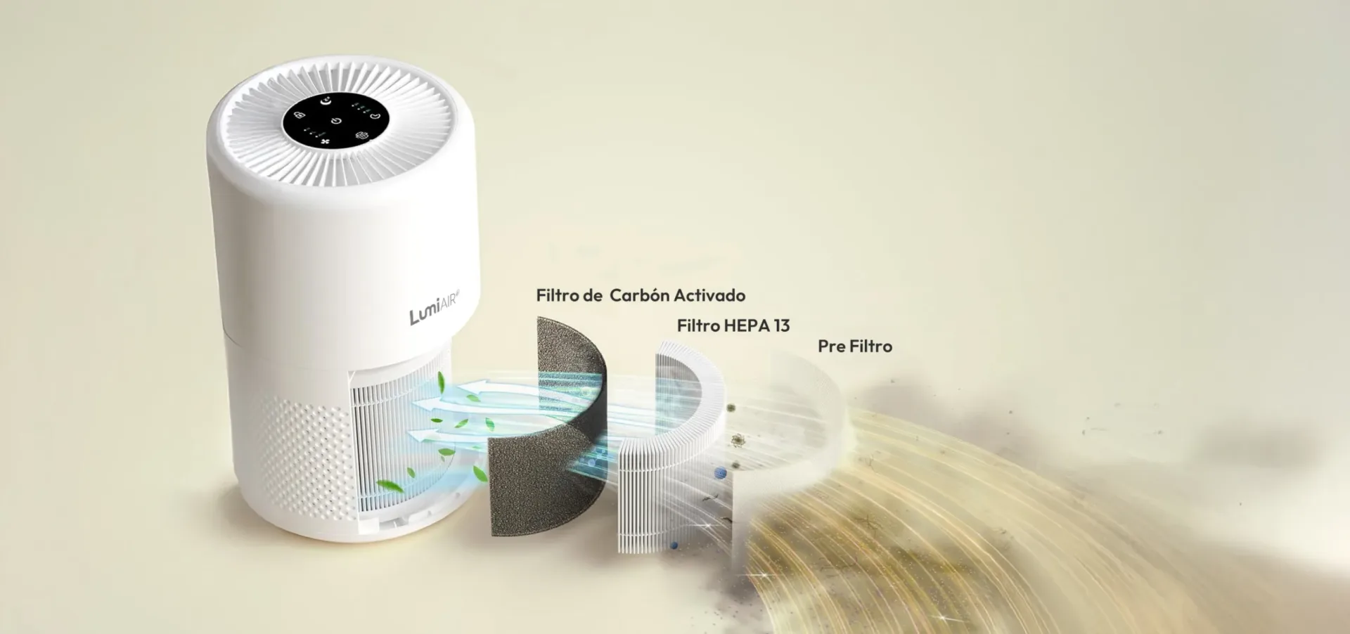 Polen, Ácaros, Pelo de mascotas; LumiAIR Gregal atrapa las partículas ayudando a disminuir las Alergias