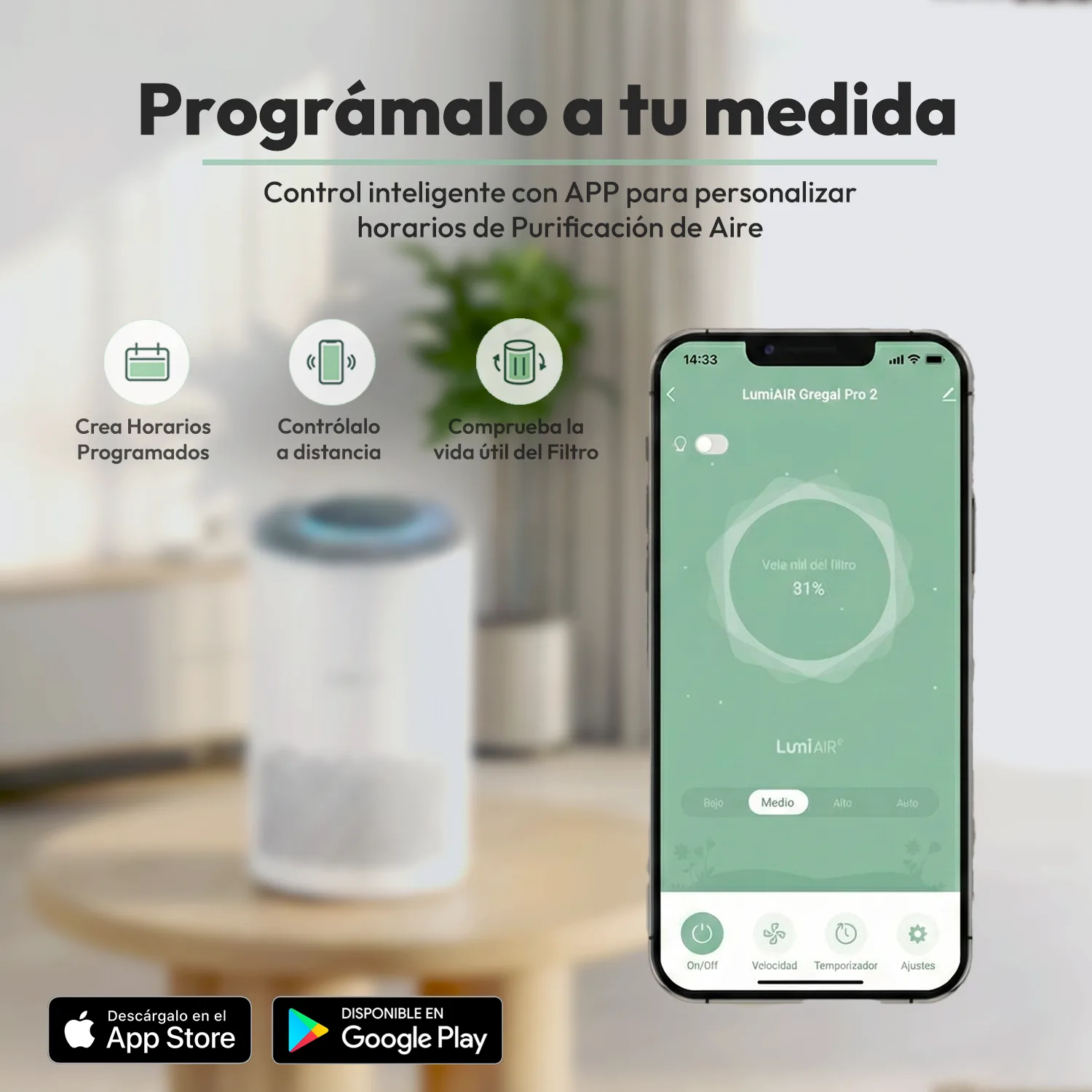 El LumiAIR Garbí de siempre, pero ahora con control adicional por App. El LumiAIR Garbí SMART es un purificador de aire diseñado para cubrir espacios de hasta 27 m² con una eficacia superior. Es uno de los tres modelos de purificador más vendidos del mundo, con calidad avalada por cientos de miles de hogares. Su avanzado sistema de filtración HEPA de 3 etapas captura el 99,97 % de las partículas en el aire, incluyendo polvo, alérgenos y contaminación, asegurando un ambiente limpio y saludable en cualquier lugar de tu hogar. Este modelo combina potencia y seguridad, siendo una solución ideal tanto para áreas de uso frecuente como para espacios más tranquilos. Con tres niveles de potencia ajustables, el LumiAIR Garbí se adapta fácilmente a tus necesidades diarias, desde un funcionamiento silencioso para momentos de relajación hasta un modo intensivo para situaciones de mayor exposición a partículas en suspensión. Su diseño compacto y elegante encaja perfectamente en cualquier espacio, añadiendo funcionalidad sin comprometer la estética. Avalado por miles de usuarios satisfechos en todo el mundo, el LumiAIR Garbí es la elección perfecta para disfrutar de un aire más limpio y saludable en tu hogar. ¡Descúbrelo y vive la diferencia!